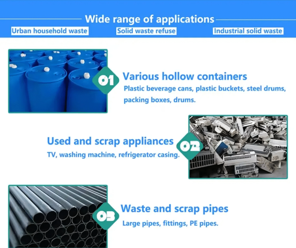can tackle a huge variety of materials, making it a valuable asset across many industries.- Recycling and Waste Management: Processes plastics (films, bottles, pipes), tires, rubber, wood, e-waste, and solid waste.